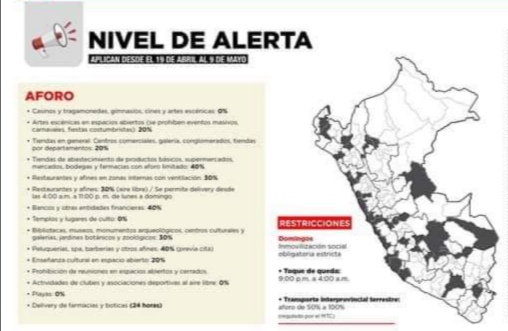 Otra disposición que regirá desde el 19 de abril en las regiones en nivel de riesgo extremo es el toque de queda de 9.00 p. m. a 4.00 a. m. Asimismo, se reducirán los aforos en el transporte interprovincial terrestre y los establecimientos comerciales y restaurantes.