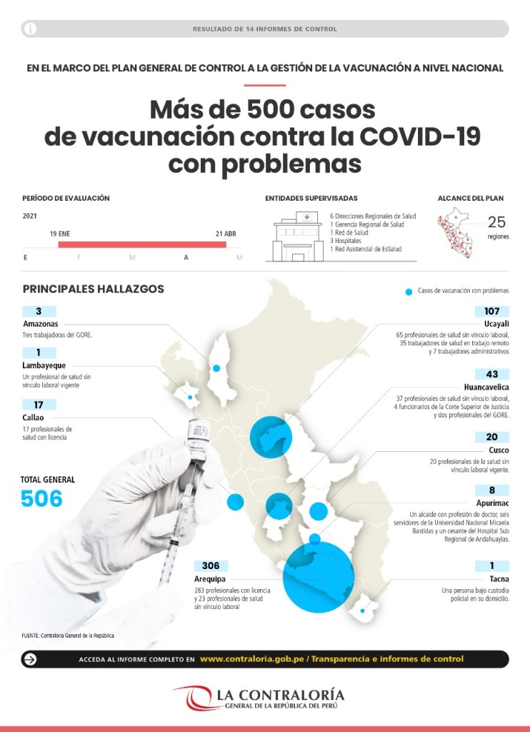 En cumplimiento del Plan de Control a la Gestión de la Vacunación contra la COVID-19, la Contraloría General de la República emitió diversos informes de control que permitieron detectar aproximadamente 506 casos en los que se advierten problemas en la vacunación en diferentes regiones del país, lo que afectó la inmunización de personas comprendidas en los grupos priorizados por las autoridades peruanas.