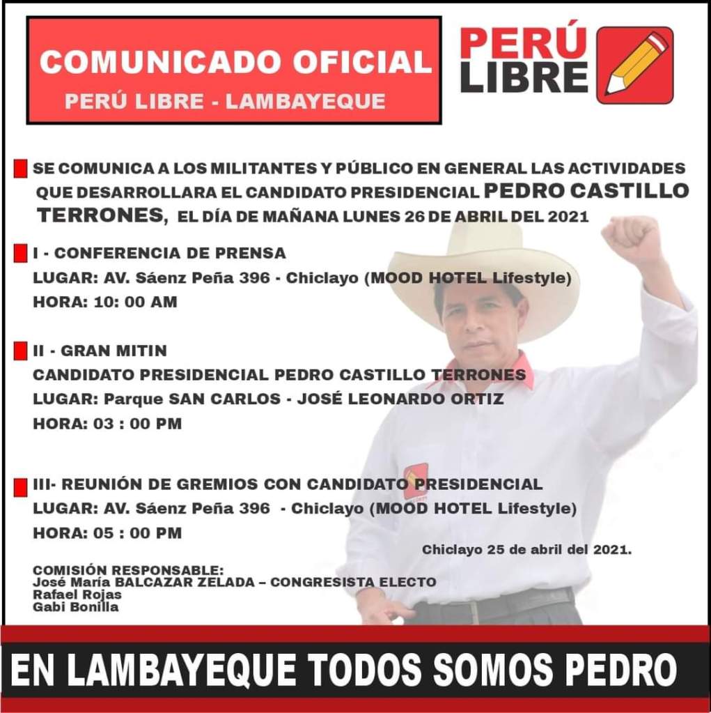 El candidato presidencial Pedro Castillo Terrones, líder de la agrupación política Perú Libre y contendor para la segunda vuelta, desarrollará diversas actividades en la región Lambayeque este lunes 26.