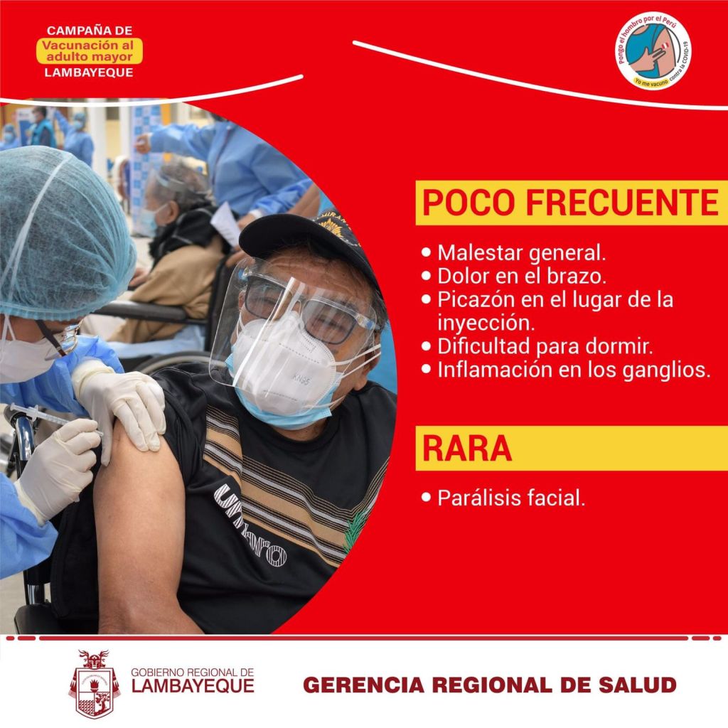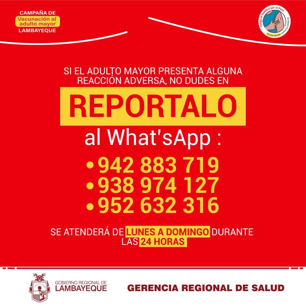 La Gerencia de Salud de Lambayeque dio a conocer los números telefónicos para llamar en caso que el adulto mayor presente las diversas reacciones que se consignan después de haber sido vacunado.