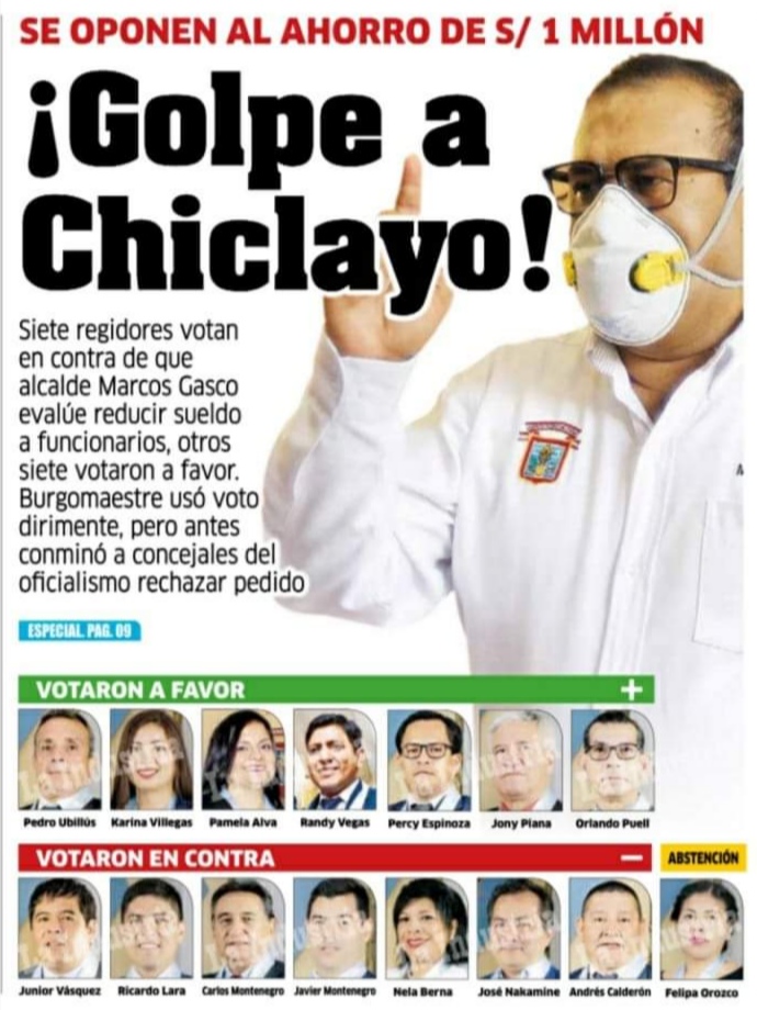 El alcalde de Chiclayo, Marcos Gasco arrobas, amenazó con dar a conocer los nombres de los regidores del oficialismo supuestamente aludidos por una compra directa, si es que no votaban en contra del pedido de evaluar la reducción de sueldos de los funcionarios, formulado por munícipes de la oposición. “… Que no voten a favor de esto y que no estén en la lista de algún evento que suceda después», se le escucha decir al burgomaestre.