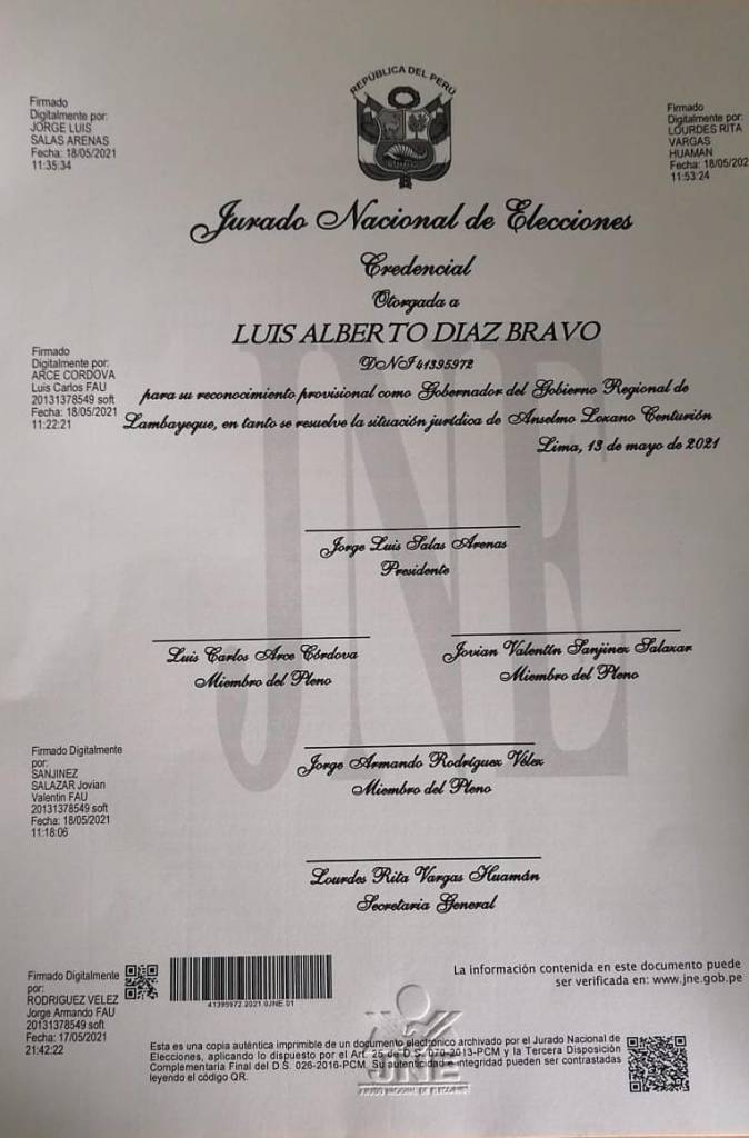 El Jurado Nacional de Elecciones (JNE) remitió al Gobernador Regional de Lambayeque, Abog. Luis Díaz Bravo, la credencial que lo reconoce como tal. El documento lleva la rúbrica digital del presidente, Jorge Luis Salas Arenas, y los tres miembros del pleno.