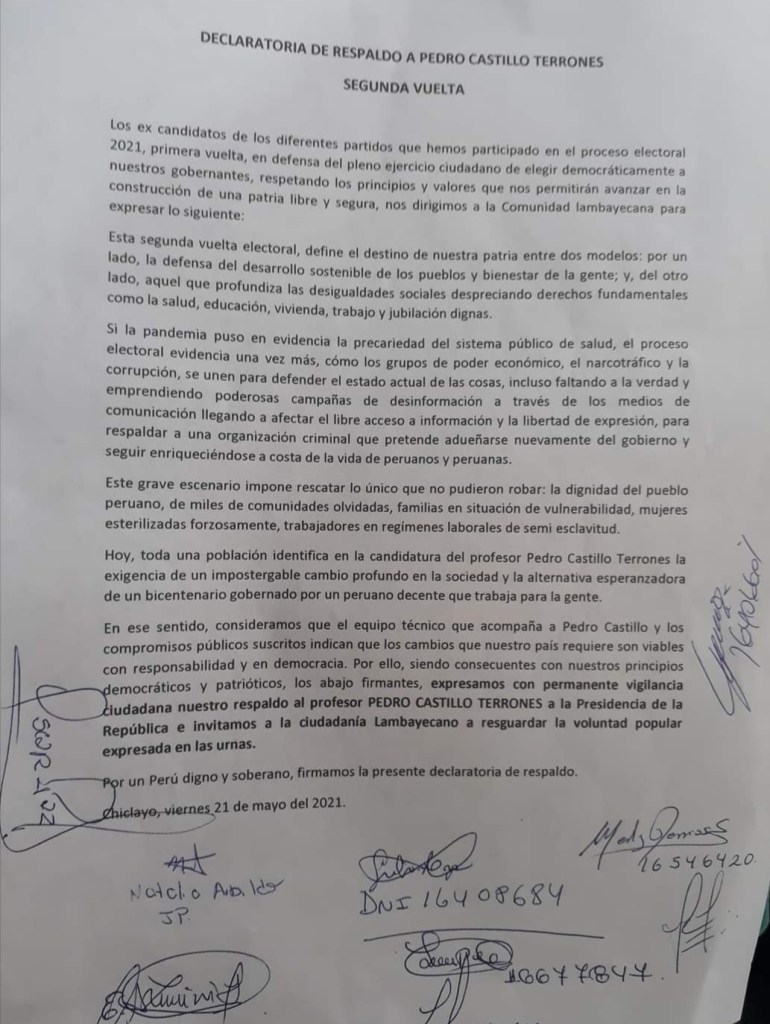 En ese sentido, consideramos que el equipo técnico que acompaña a Pedro Castillo y los compromisos públicos suscritos indican que los cambios que nuestro país requiere son viables con responsabilidad y en democracia. Por ello, siendo consecuentes con nuestros principios democráticos y patrióticos, los abajo firmantes expresamos con permanente vigilancia ciudadana nuestro respaldo al profesor Pedro Castillo Terrones a la Presidencia de la República e invitamos a la ciudadanía lambayecana a resguardarla voluntad expresada en las urnas.
