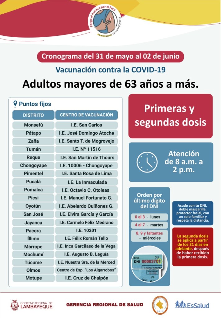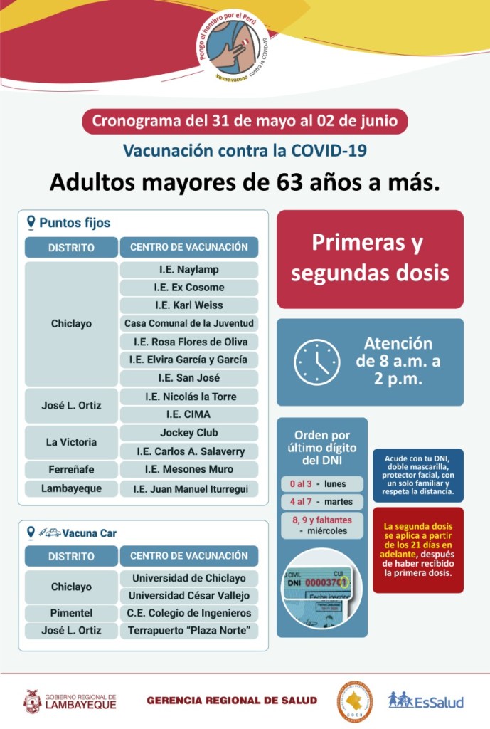 Del lunes 31 de mayo al miércoles 2 de junio se vacunará a las personas mayores de 63 años.y para ello se han establecido numerosos centros de inmunización, así como Vacuna Car en toda la región, informó la Gerencia de Salud de Lambayeque.