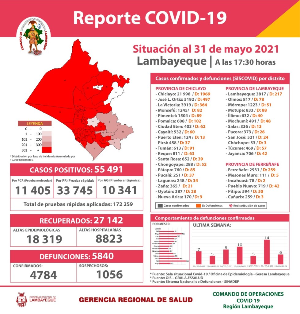 En los cinco primeros meses del año 2021 en Lambayeque unas 3,328 personas han muerto y 21,854 se han contagiado por el Covid. Del total de fallecidos, cerca de 2 mil corresponden a la provincia de Chiclayo, que es la más afectada por la pandemia. Cabe señalar que este mes de mayo se redujo el número de víctimas con respecto las registradas el último abril.