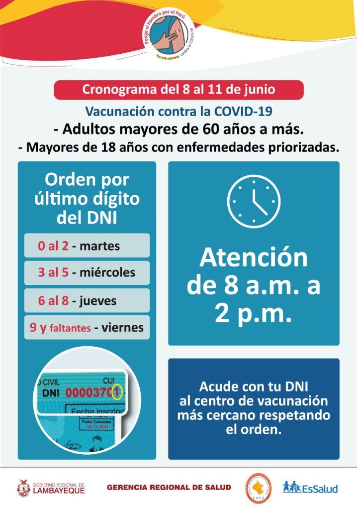 Desde este martes 8 al 11 de junio se desarrolla una nueva jornada de vacunación contra la COVID-19, recordó la Gerencia regional de Salud de Lambayeque. Se pidió respetar el orden para una vacunación segura.