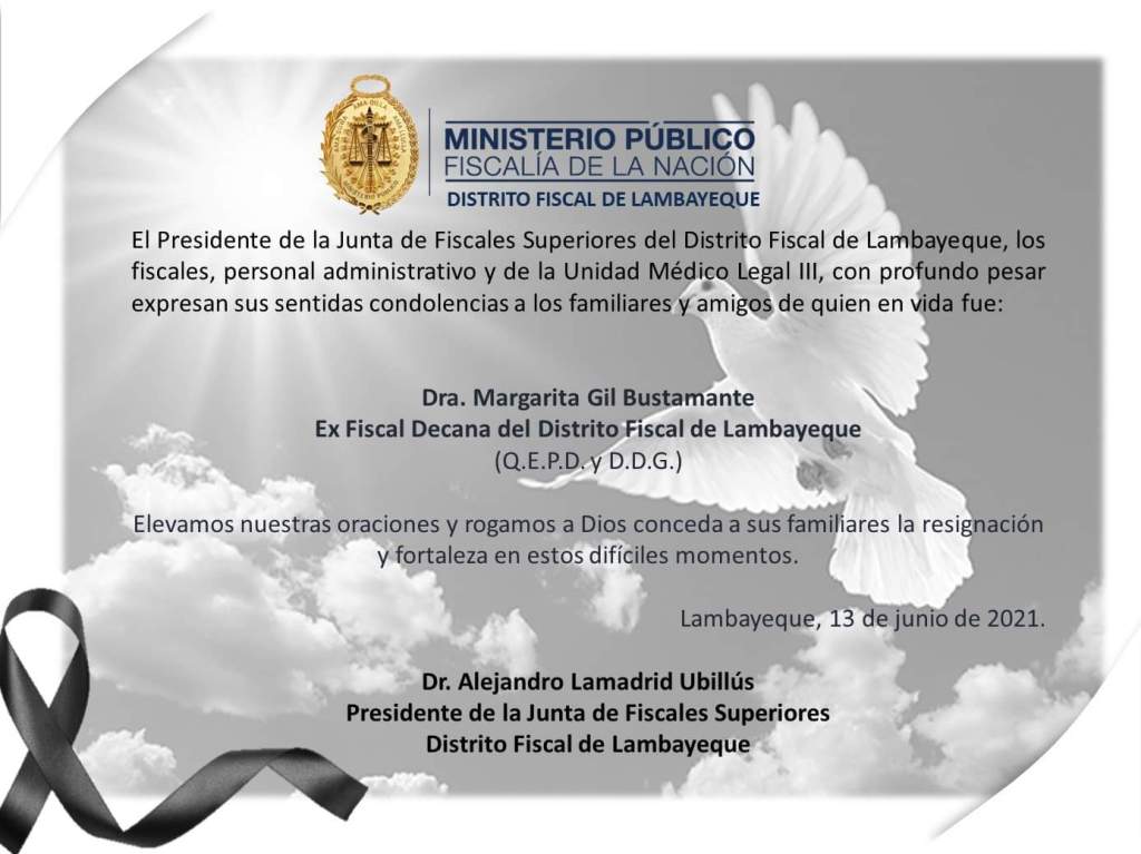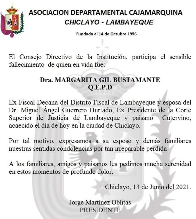 Esta tarde dejó de existir en Chiclayo la doctora Margarita Gil Bustamante, exfiscal decana del Distrito Fiscal de Lambayeque y esposa del Dr. Miguel Ángel Guerrero Hurtado, expresidente de la Corte Superior de Justicia de Lambayeque.