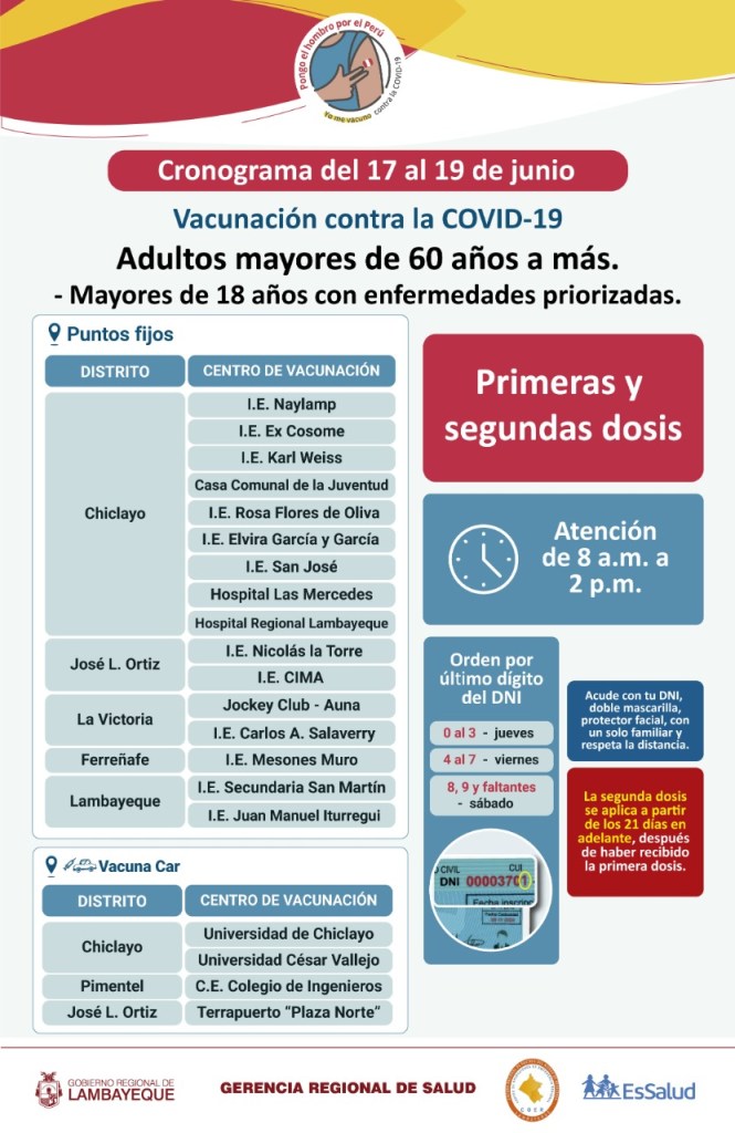 Se retoma la vacunación contra la COVID-19 para adultos mayores de 60 años a más, del jueves 17 al sábado 19 de junio, informó esta noche la Gerencia Regional de Salud de Lambayeque. Aquí los centros de vacunación: