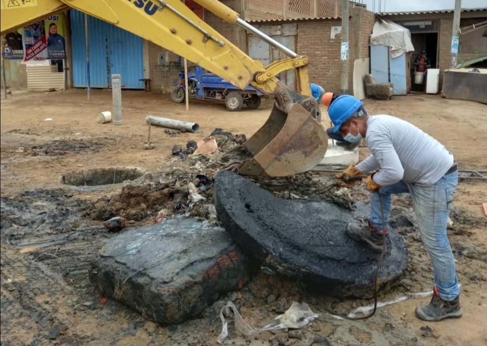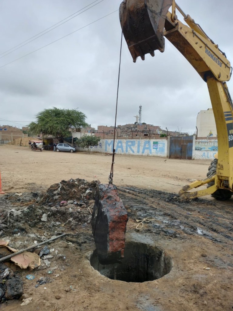 En el interior de los buzones que se ubicaban en la prolongación San Judas Tadeo, en Ciudad del Chofer, se ha encontrado bloques de concreto con ladrillo de gran tamaño utilizándose, para su extracción, el apoyo de una retroexcavadora y también el apoyo personal operativo para la extracción de toda la basura arrojada a los buzones.