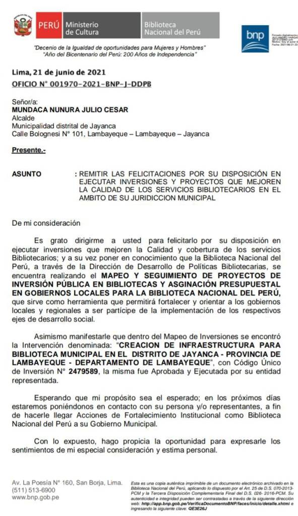La Biblioteca Nacional del Perú, a través de la Dirección de Desarrollo de Políticas Bibliotecarias, felicita a la Municipalidad Distrital de Jayanca, por su disposición en ejecutar inversiones y proyectos que mejoren la calidad de los servicios bibliotecarios en el distrito.