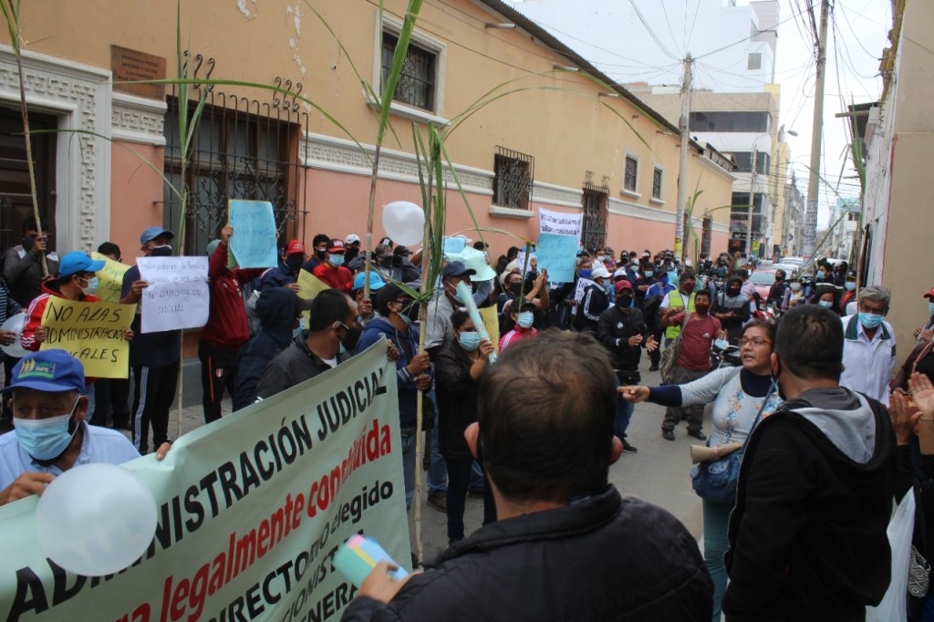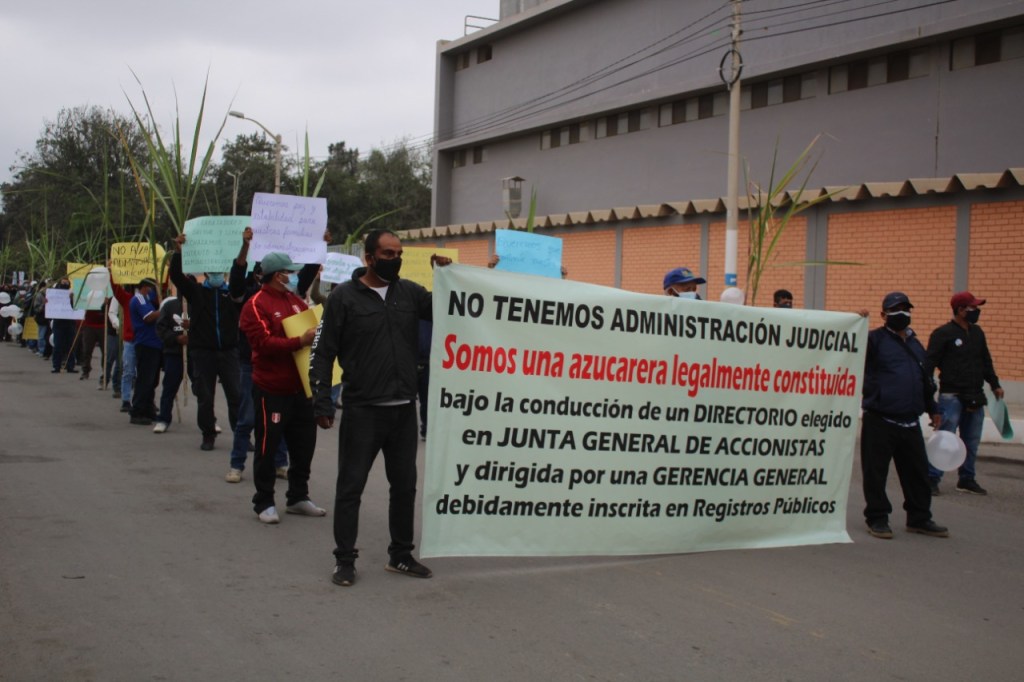 Los manifestantes, portando banderolas, pancartas y cañas de azúcar se ubicaron en el frontis de la sede judicial para alzar su voz de protesta, puesto que, según dijeron, una posible administración desestabilizaría y pondría en riesgo la continuidad de las operaciones en la agroindustrial que hasta la fecha se realizan con paz laboral, lo que permite que sus trabajadores reciban al día sus sueldos todos los meses.