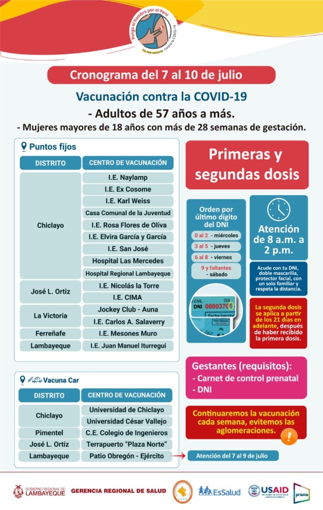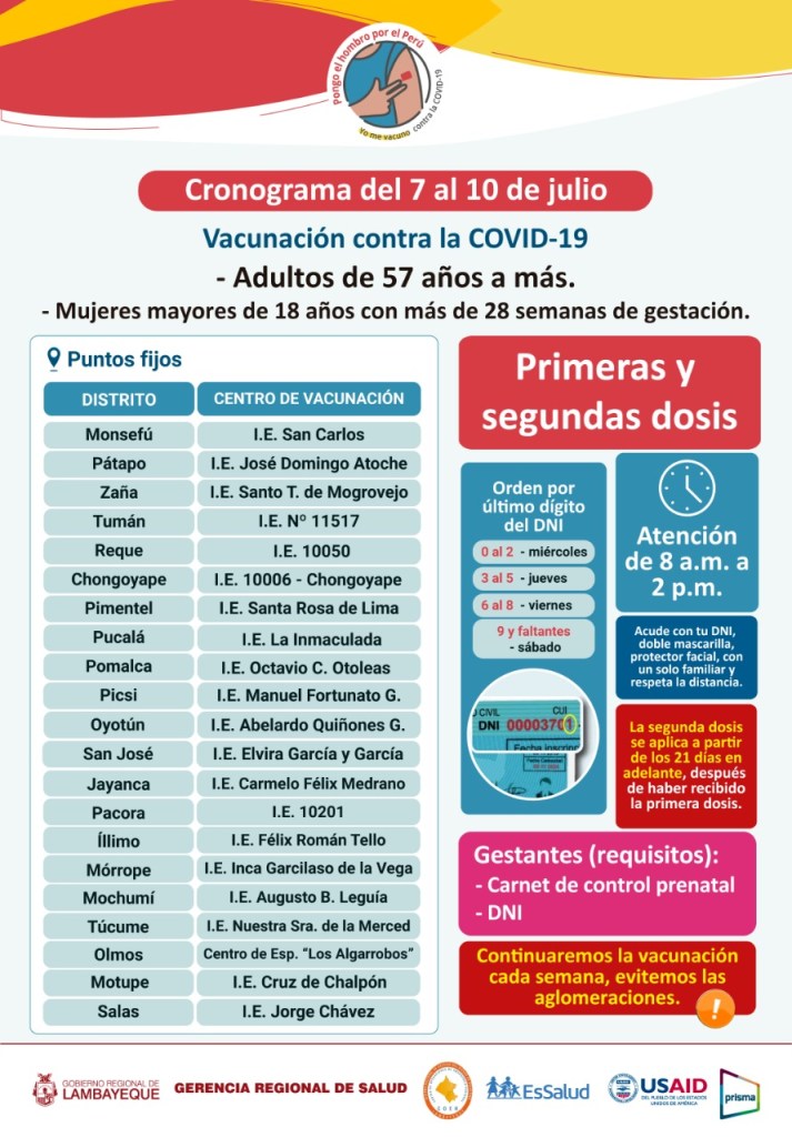 Luego de constantes gestiones realizadas ante el Ministerio de Salud por el Gobierno Regional de Lambayeque, a través de la Gerencia Regional de Salud, se logró la programación de la campaña de vacunación contra la COVID-19 para mayores de 57 años en 41 centros de vacunación en toda la región, del 7 al 10 de julio.