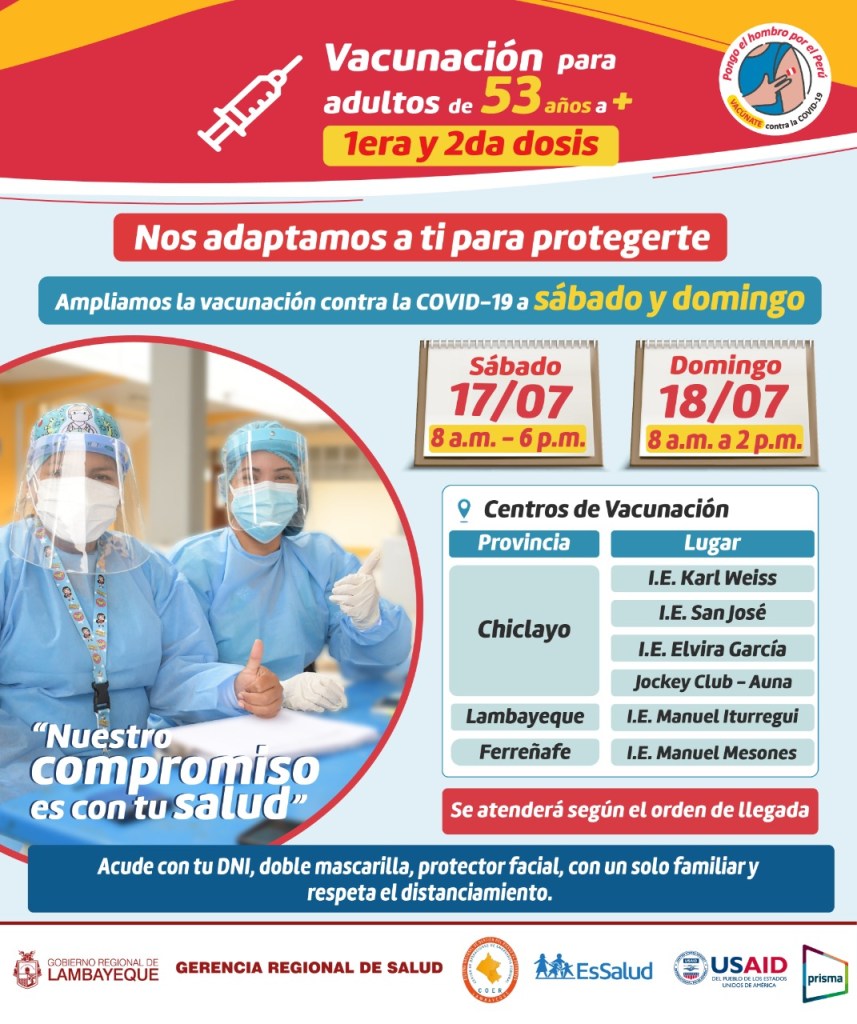 El sábado 17 de julio se atenderá de 8 a.m. a 6 p.m. y el domingo 18 de 8 a.m. a 2 p.m. Para la provincia de Chiclayo, el horario se extenderá en los centros de vacunación habilitados en el Jockey Club – Auna, I.E. Karl Weiss, I.E. Elvira García e I.E. San José. Para Ferreñafe estará disponible la I.E. Mesones Muro y en Lambayeque la I.E. Juan Manuel Iturregui.