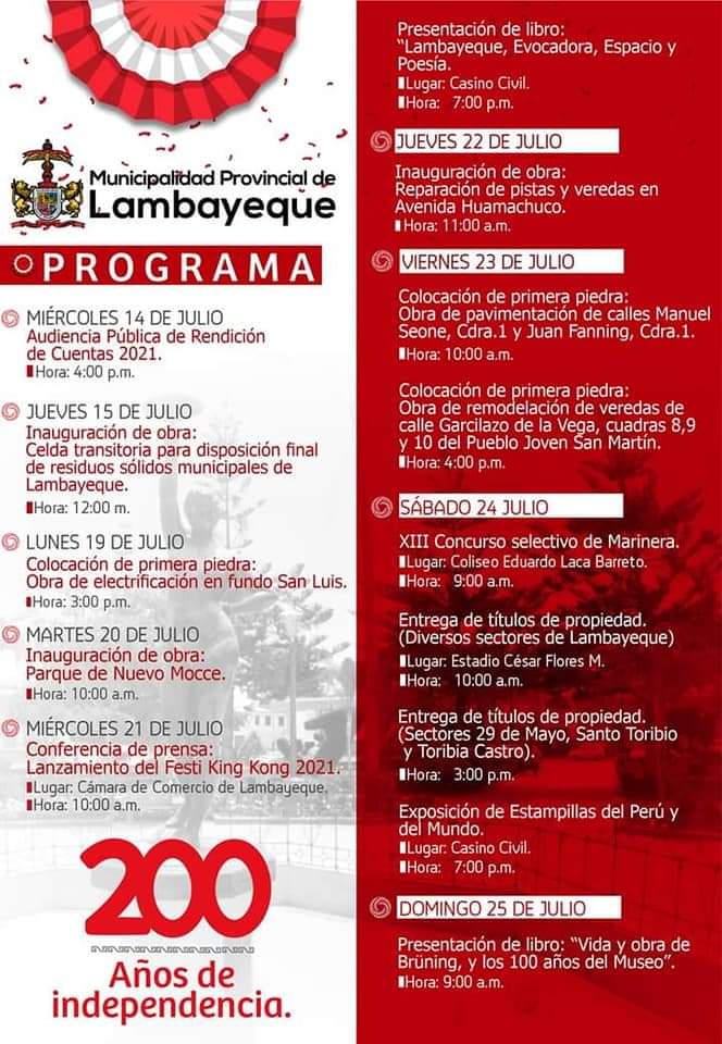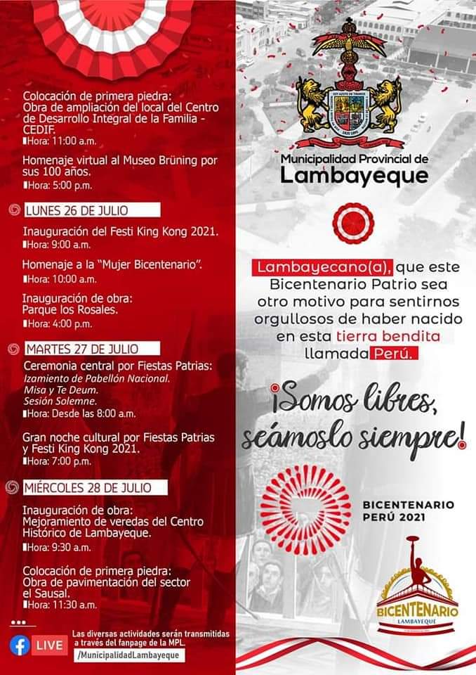 La Municipalidad provincial de Lambayeque compartió el programa central de actividades por el Bicentenario de la Proclamación de la Independencia del Perú. «Los invitamos a participar de nuestra programación virtual a través de la página oficial de la Municipalidad Provincial de Lambayeque», señala la entidad.