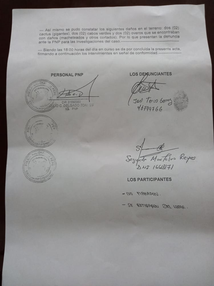 Estas nuevas invasiones se estarían produciendo en los alrededores de los centros poblados como Piedra Parada, los mismos que desde la Municipalidad Distrital de Chongoyape se les convocando para su “saneamiento físico legal”, es decir, su titulación, con apoyo del COFOPRI, sin tenerse en cuenta que dichas áreas son parte del territorio comunal y ya debidamente titulados. Según Edivar Carrasco, presidente de la Comunidad Campesina, esto “sería una sospechosa coincidencia, que no respeta que estas tierras son propiedad de la Comunidad Campesina y que de acuerdo a ley son inalienables e inembargables y que, además, son parte del ACP Chaparrí”; por lo que hace un llamado a las autoridades para ayudar a desalojar a estas personas.