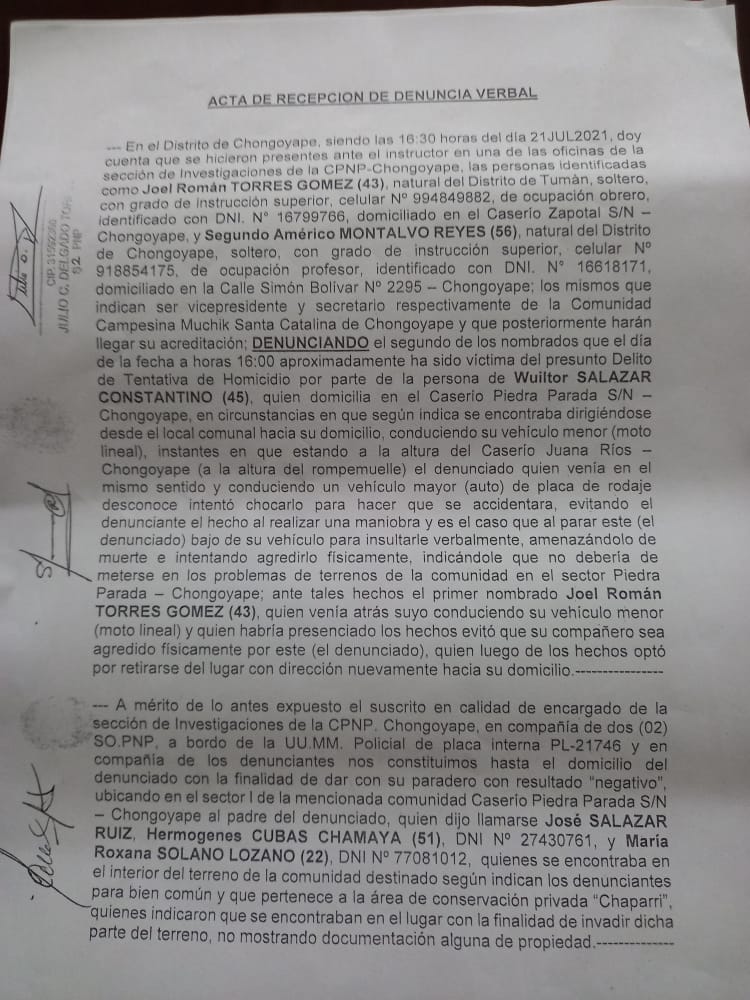 La defensa de sus tierras, el patrimonio arqueológico regional y de la reserva ecológica, según Javier Ruiz del Frente de Defensa Salvemos Chaparrí “estaría poniendo en alto riesgo a los comuneros en especial a sus directivos que vienen siendo criminalizados, agredidos e inclusive con riesgo de muerto”, como las recientes agresiones contra los directivos Joel Torres (Vicepresidente) y Américo Montalvo (Secretario) que vienen realizado las denuncias ante la Policía Nacional por las invasiones últimas, que han incluido tentativa de asesinato contra este último al que se le intentó despistar embestido por un auto conducido por uno de los líderes de las invasiones; por lo que hace un llamado a las autoridades y a la comunidad internacional velar por la seguridad de estos reconocidos defensores ambientales de nuestra región.