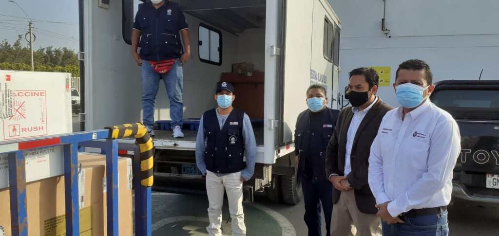 El gobernador regional, abogado Luis Díaz Bravo en compañía del gerente regional de Salud, Dr. Alipio Rivas, recibieron hoy un lote de 27 mil 682 dosis de vacunas SINOPHARM. El nuevo envío posibilita continuar con el proceso de vacunación del grupo etario de 43 años a más, y que empieza desde hoy en horario de 8:00 am. a 6:00 pm.- día viernes y sábado-, y el domingo de 8:00 am a 2:00 pm.