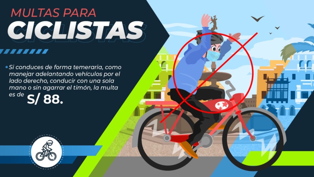 Por circular con personas que no ocupen los asientos especialmente acondicionados para tal finalidad se aplicará una multa de S/ 88. Circular por la vereda equivale a una multa de S/ 22. Solo puedes manejar por esa vía cuando no exista ciclovía y se encuentre prohibida su circulación por la calzada.