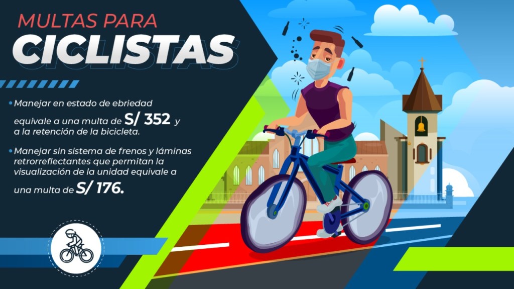 Manejar en estado de ebriedad. Se sancionará al conductor que tenga más de 0.5 gramos de alcohol por litro de sangre o por consumo de drogas con una multa de S/ 352 (muy grave), y, además, se retendrá la bicicleta.