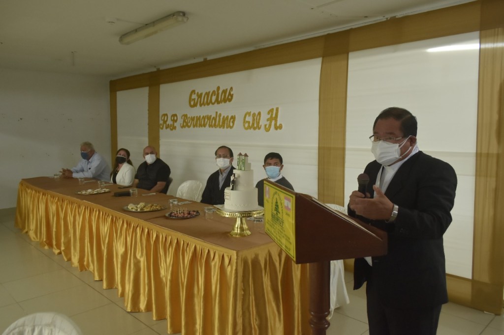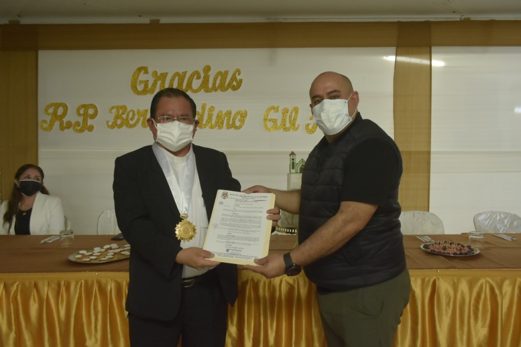 El alcalde, Rony Olivera colocó la medalla de la Ciudad en reconocimiento a su labor pastoral en el distrito. La autoridad edil destacó las acciones benéficas y predisposición de Padre Bernardino quien ha contribuido a mantener la fe y unidad de las familias Victorianas. A su turno el Padre Bernardino Gil expresó su agradecimiento a las autoridades ediles, grupos parroquiales y toda la comunidad católica por haber apoyado en esta labor de evangelización a la feligresía católica de las familias Victorianas.