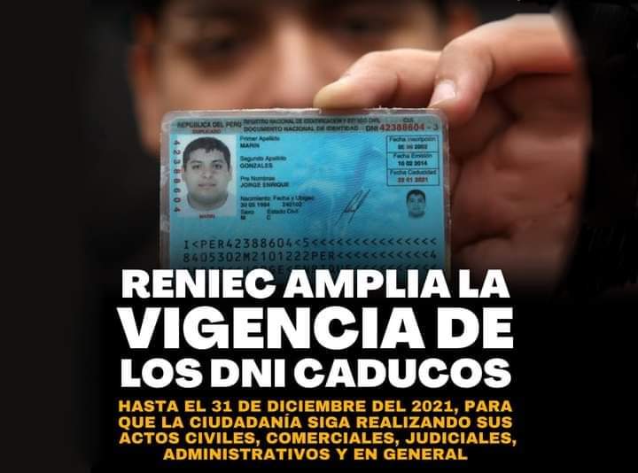 Hasta el 31 de diciembre de 2021 se amplía la vigencia de los DNI caducos o que estén por caducar, para garantizar que la ciudadanía pueda realizar actos civiles, comerciales, administrativos, judiciales, entre otros.