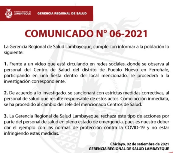 La Gerencia regional de Salud de Lambayeque anunció la inmediata separación del jefe del Centro de Salud del distrito de Pueblo Nuevo, en Ferreñafe, tras conocerse la difusión de un vídeo en el que se desarrollaba una fiesta en el interior de dicho establecimiento sanitario.
