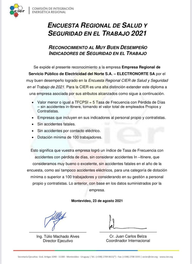 El presente reconocimiento a la Empresa Regional de Servicio Público de Electricidad del Norte S.A. – Electronorte SA, es por haber logrado un índice de tasa de frecuencia sin accidentes fatales en el año de la encuesta, ni tampoco accidentes eléctricos, para una categoría de dotación mínima o superior a 100 trabajadores y considerando en su gestión a personal propio y contratistas.