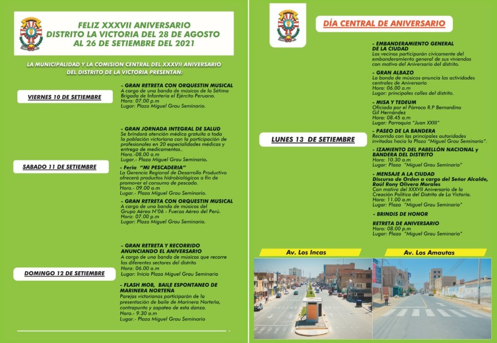 La Municipalidad distrital de La Victoria, en Chiclayo, a través de la Comisión Central continúa con las actividades por el 37 aniversario de creación política del distrito, con una serie de actividades de entretenimiento, salud, artísticas y la ceremonia central de aniversario, así como una maratón especial para los jóvenes.