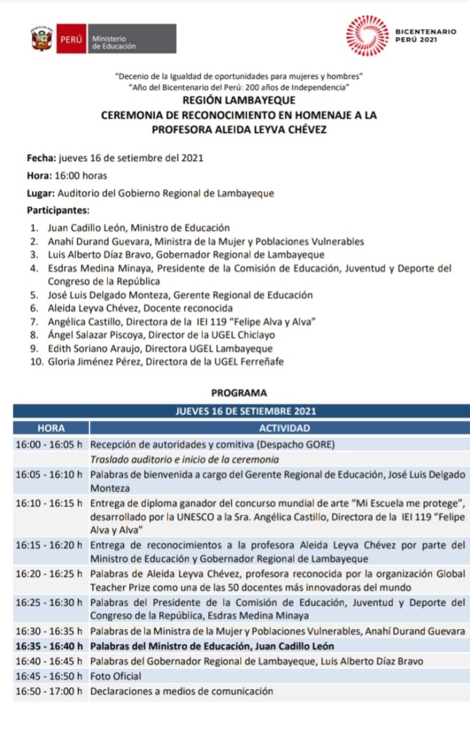 Los ministros de: Educación y de la Mujer, Juan Cadillo León y Anahí Durante Guevara, llegan está tarde a Chiclayo para estar presentes en la ceremonia de reconocimiento a la profesora chiclayana Aleyda Leyva, reconocida entre las 50 mejores docentes del mundo. La cita será a las 4:00 de esta tarde en el auditorio del Gobierno Regional de Lambayeque, según el programa que se consigna: