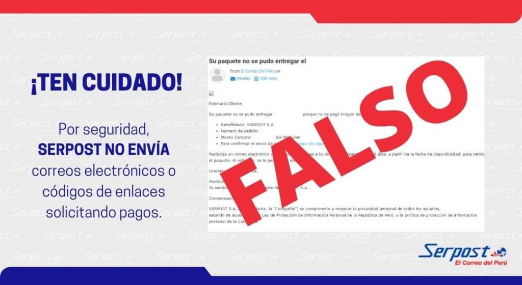 ¡Cuidado! Serpost, empresa adscrita al Ministerio de Transportes y Comunicaciones (MTC), exhorta a los ciudadanos a estar alertas ante la llegada de cualquier correo electrónico, mensaje de texto o mensaje vía WhatsApp en los que se soliciten pagos por los servicios postales.