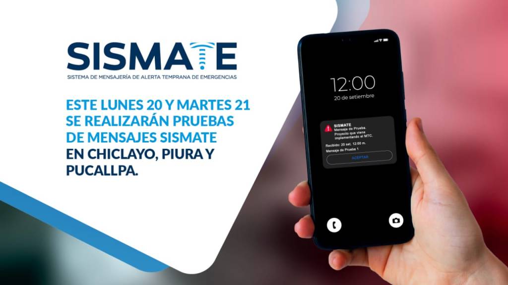 Con la finalidad de proceder con la implementación definitiva del Sistema de Mensajería de Alerta Temprana de Emergencias (Sismate) y comprobar su funcionalidad, el Ministerio de Transportes y Comunicaciones (MTC) continúa con el envío de mensajes de prueba a los celulares en diversas localidades del país.