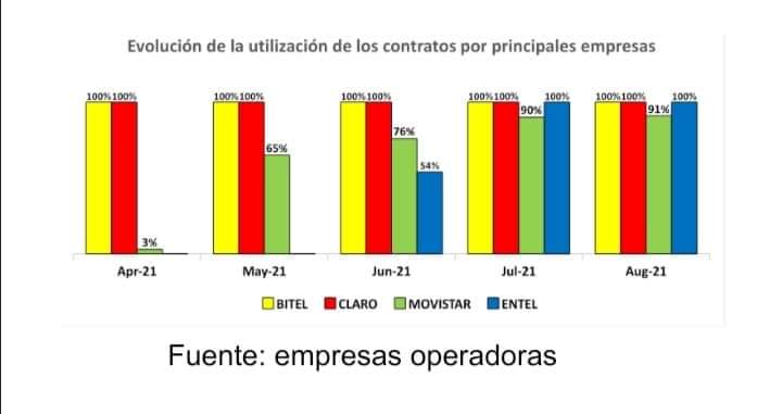 Las empresas Claro, Entel y Bitel indicaron que en julio y agosto emplearon los contratos cortos en todas sus contrataciones, siendo 1,42 millones de contratos cortos emitidos por Claro, seguidos por 1,19 millones de contratos cortos de Entel y poco más de 1,02 millones de contratos cortos de Bitel. En cambio, Telefónica informó que emitió 635 534 contratos cortos en julio y 626 858 contratos cortos en agosto, equivalentes al 90% y 91 % del total de sus contrataciones, respectivamente.