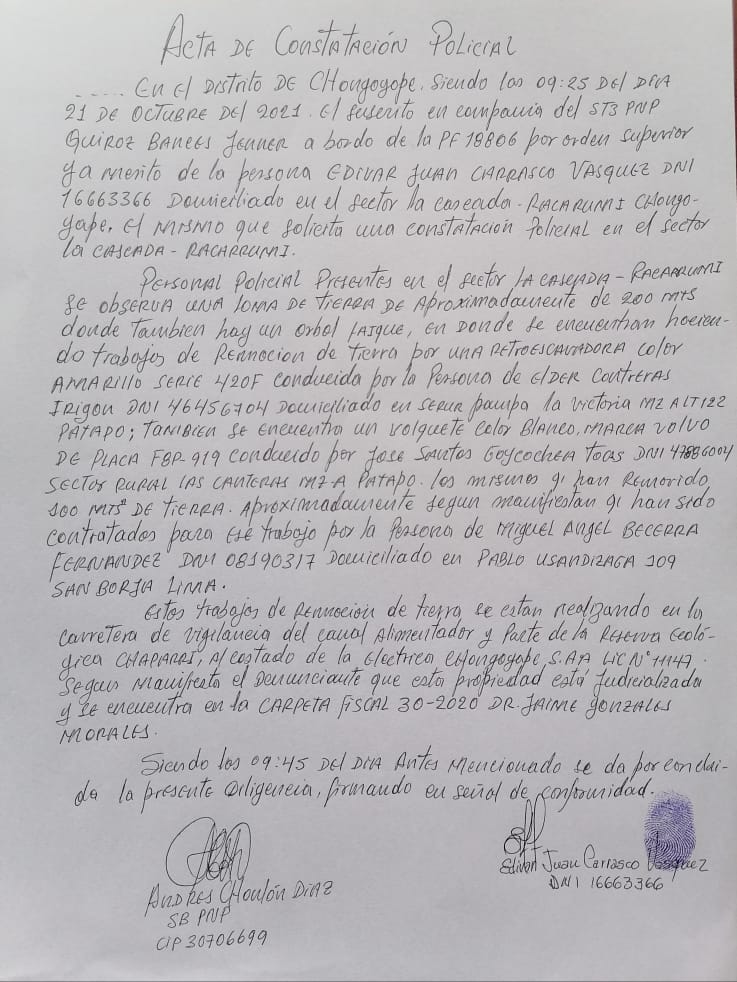 Por su parte Edivar Carrasco, como responsable de la administración de Chaparrí, en su condición de presidente de la Comunidad expresó que las obras que se vienen realizando que incluyen la remoción de tierras y el avance de un muro de material noble, no responden a lo normado en el Plan Maestro para usos del suelo protegido. Asegurando el área afectada es propiedad comunal y parte del Áreas Naturales Protegidas del Perú. Además, para mayor detalle entregará a la Policía Nacional la información respectiva sobre las carpetas fiscales y judiciales, así como las búsquedas realizadas en Registros Públicos que demostrarían de manera contundente que no existe propiedad alguna registrada a nombre del mencionado empresario, ni a nombre de su empresa Eléctrica Chongoyape SAC.