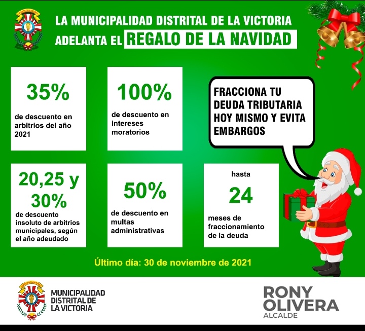 La Municipalidad distrital de La Victoria a través del Acuerdo de Concejo Municipal 027-2021 otorga nuevos beneficios tributarios a los vecinos con descuentos hasta el 100% de los intereses moratorios.