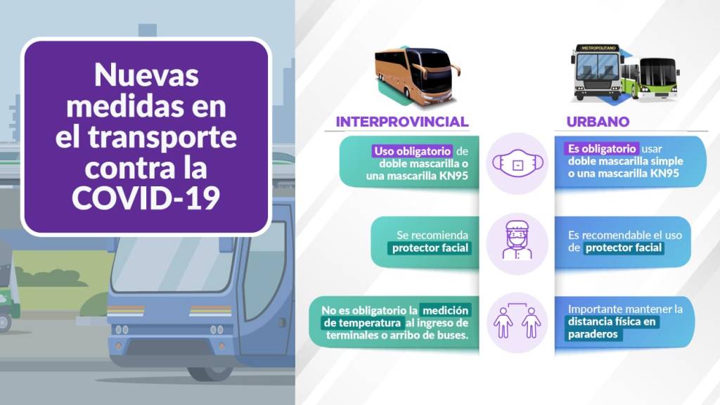 En adelante, los pasajeros, conductores, tripulación y cobradores, de los diferentes servicios de transporte público, como el interprovincial, provincial, turístico, taxi, vehículos menores, entre otros, deben usar obligatoriamente doble mascarilla (una quirúrgica y sobre ella una comunitaria) o una mascarilla KN95.