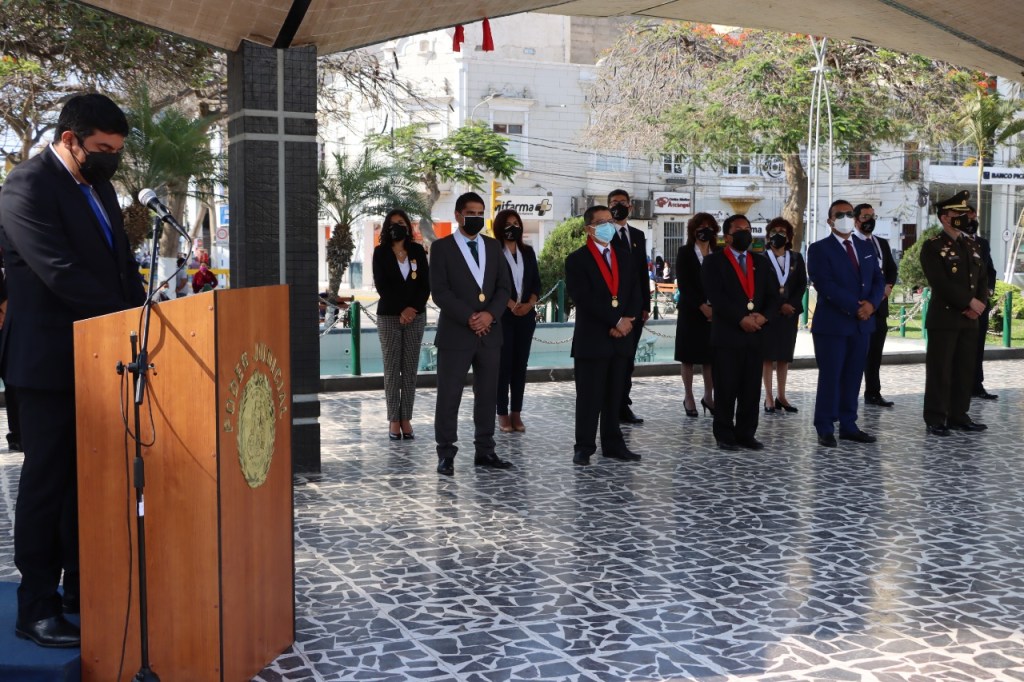 Las actividades por el aniversario se iniciaron en la pérgola del Parque Principal de Chiclayo con el izamiento del Pabellón Nacional y la bandera del Poder Judicial del Perú; así como la entonación de los respectivos himnos.