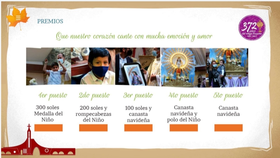 Los premios que se entregarán son, para el primer puesto, 300 soles y medalla del Niño del Milagro; segundo puesto, 200 soles y rompecabezas del Niño del Milagro; tercer puesto, 100 soles y canasta navideña; cuarto puesto, canasta navideña y polo del Niño; y quinto puesto, canasta navideña.