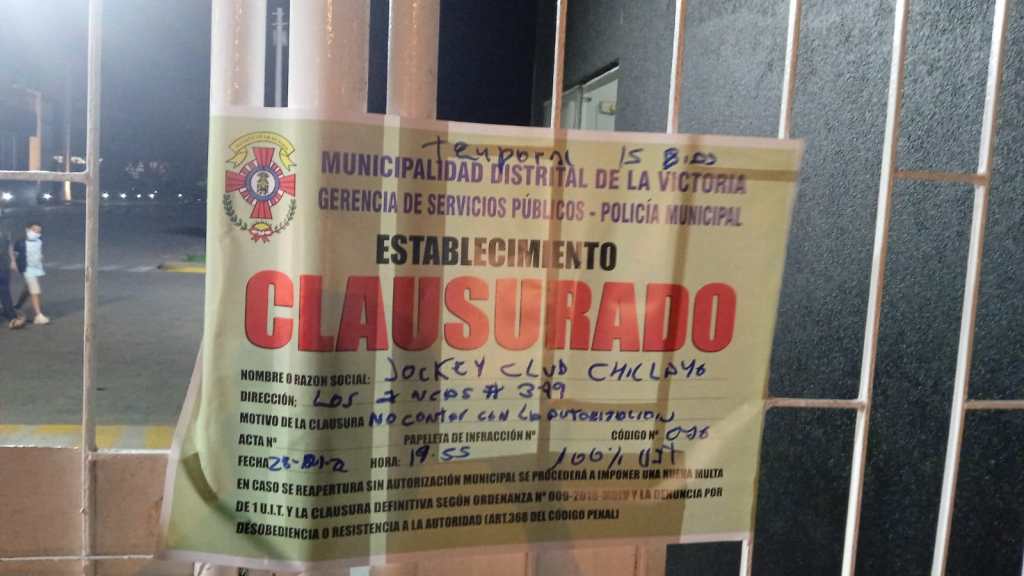 La Municipalidad Distrital de La Victoria ha clausurado y multado hoy las instalaciones del Jockey Club de Chiclayo al encontrarse infraganti realizando un evento social prohibido por la emergencia sanitaria del Covid 19.