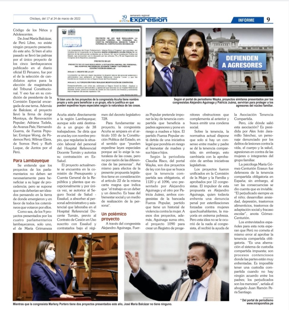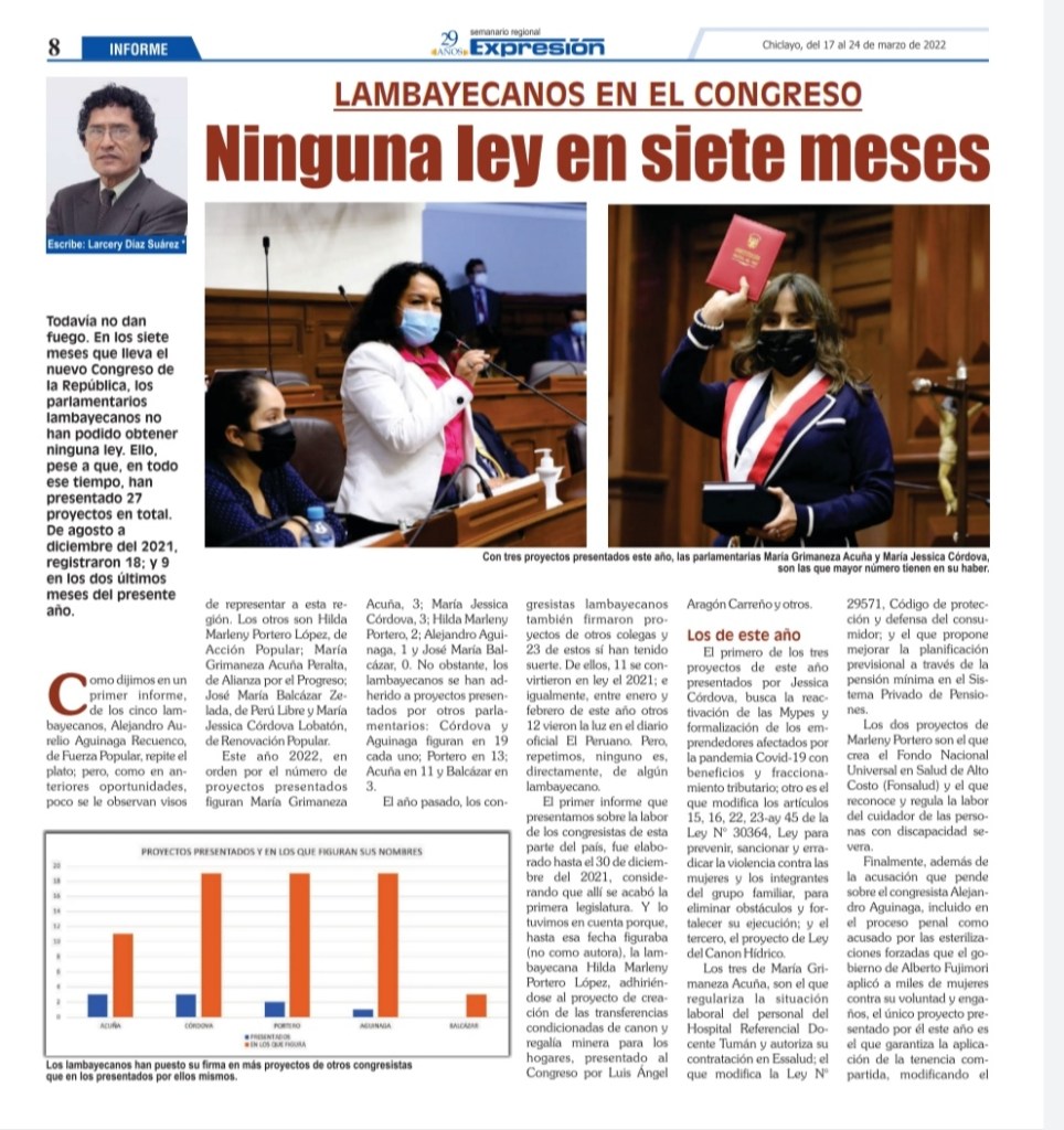 Informe de Larcery Díaz Suárez, publicado en el Semanario Expresión, de Chiclayo, jueves 17 de marzo de 2022.