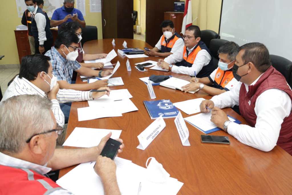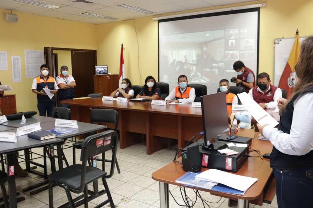 La reunión se realizo en la sala de crisis del Centro de Operaciones de Emergencia Regional COER Lambayeque, con asistencia del Grupo de Trabajo integrado por los gerentes y funcionarios de confianza del GORE, los miembros de la Plataforma de Defensa Civil Regional y la Entidades de Primera Respuesta.