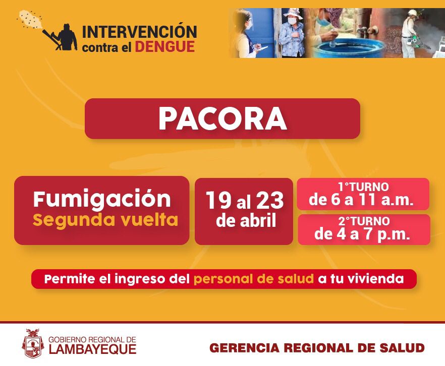 A raíz de los 67 casos de Dengue detectados hasta la fecha en el distrito de Pacora, la Gerencia Regional de Salud Lambayeque ha programado el segundo ciclo de fumigación para eliminar al zancudo adulto transmisor de la enfermedad, que circula en esta localidad.e solicita la colaboración de la población para permitir el ingreso del personal de salud a sus viviendas y cumplir con la actividad.
