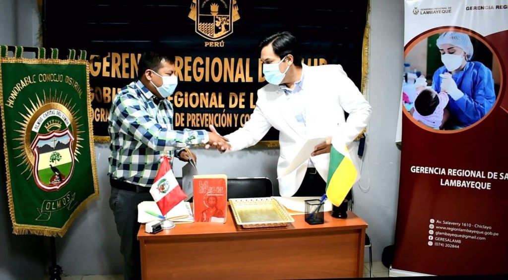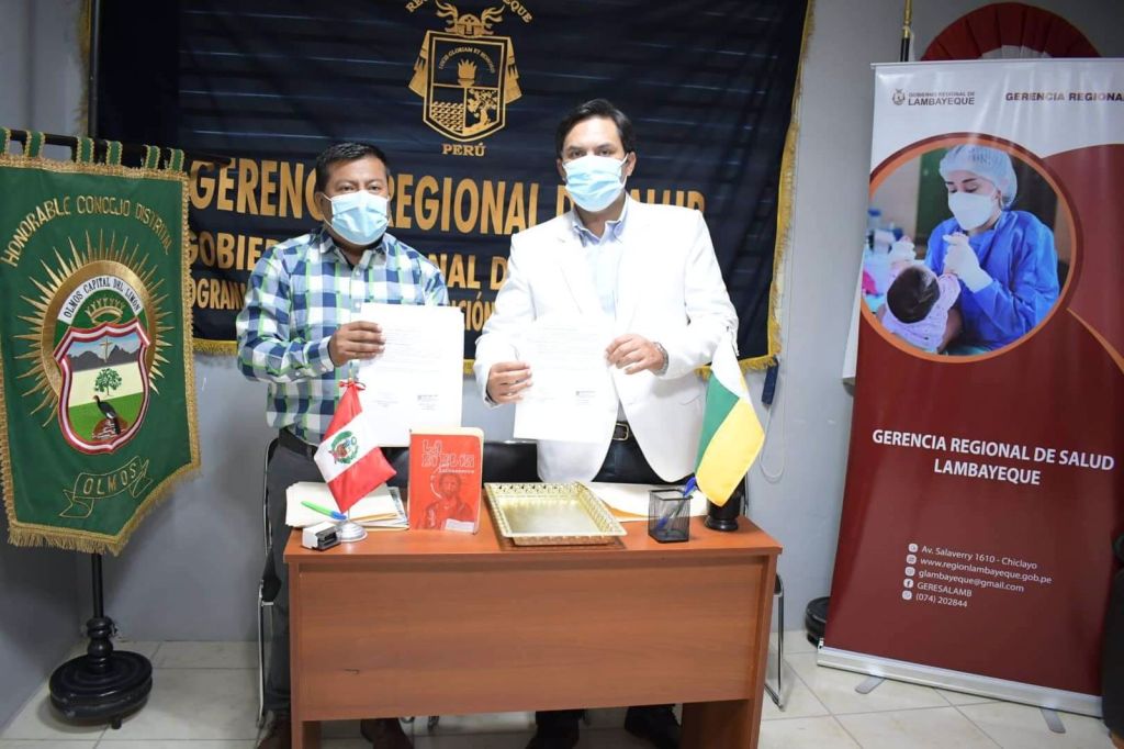 El gerente regional de Salud de Lambayeque, Dr. Alipio Rivas Guevara y el alcalde de la Municipalidad de Olmos, Javier Roque Antón, suscribieron un convenio para la implementación de un nuevo Centro de Salud Mental Comunitario para la atención de más de 100 mil habitantes en este importante distrito y zonas aledañas.