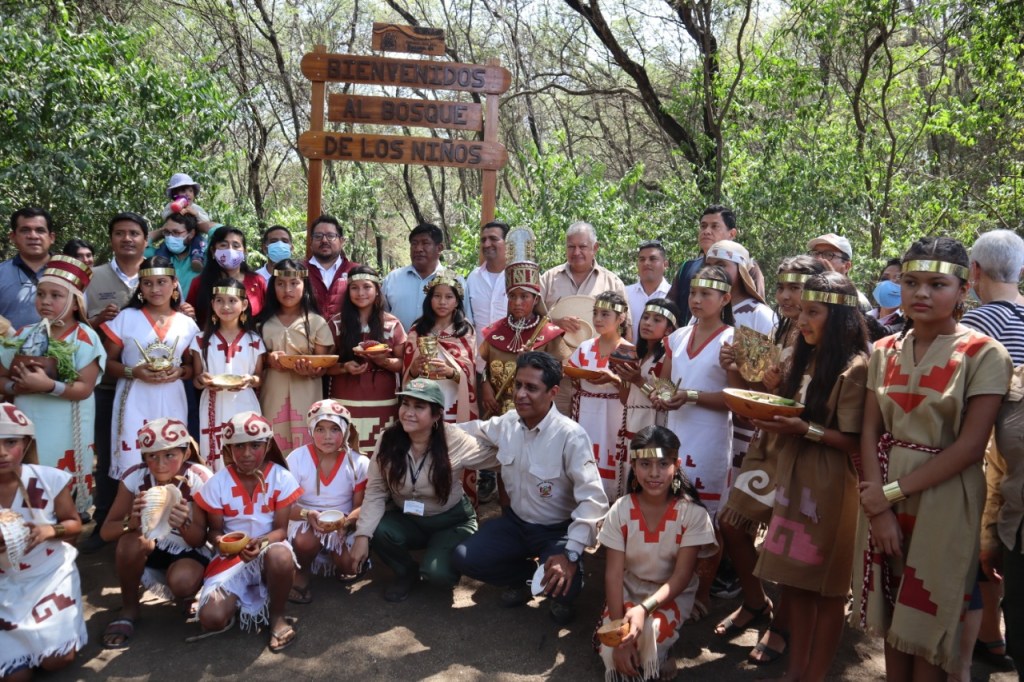 Los visitantes fueron recibidos por un séquito de niños quienes escenificaron al Señor de Sicán y sus acompañantes, los mismos que estuvieron representados por los alumnos de la I.E Educativa Medalla Milagrosa de la ciudad de Ferreñafe, quienes estuvieron bajo la preparación del equipo de arqueólogos y profesionales del Museo Nacional de Sicán. Estos niños conformarán la I Brigada de Niños Guarda parques del Bosque de Pómac.