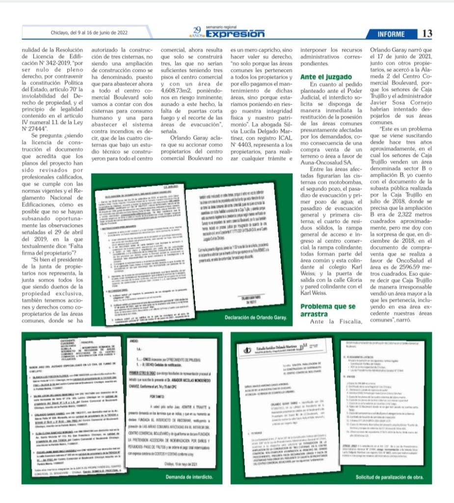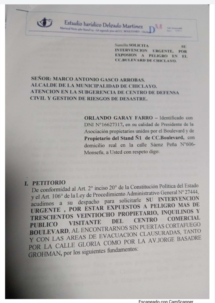 La Asociación de propietarios unidos por el Boulevard, ha solicitado la inmediata intervención de las autoridades municipales y judiciales de Chiclayo, para que se paralice la obra denominada “Ampliación de construcción de Cisternas en el Centro Comercial Boulevard”. En tal sentido, se han dirigido a la municipalidad provincial y al Poder Judicial; en este último interponiendo demanda de interdicto de recobrar de áreas comunes afectadas en ese establecimiento comercial.
