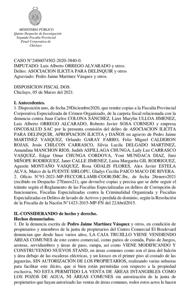 Ante la Fiscalía, Orlando Garay narró que el 17 de junio de 2021, él, junto con otros propietarios se acercaron a la Alameda 2 del Centro Comercial Boulevard, porque los señores de Caja Trujillo y el administrador Javier Sosa Cornejo intentaron despojarlos de sus áreas comunes. “Este es un problema que se viene suscitando desde hace tres años aproximadamente, en el cual los señores de Caja Trujillo venden un área denominada sector B o ampliación B, yo cuento con el documento de la subasta pública realizada por la Caja Trujillo en julio de 2018, donde se precisa que la ampliación B era de 2,322 metros cuadrados aproximadamente, pero me doy con la sorpresa de que, en diciembre de 2018, en el documento de compraventa que se realiza a favor de OncoSalud el área es de 2596.59 metros cuadrados. Eso quiere decir que Caja Trujillo de manera irresponsable vendió un área mayor a la que les pertenecía, incluyendo en esa área excedente nuestras áreas comunes”, narró. (Fotos tomadas de internet).