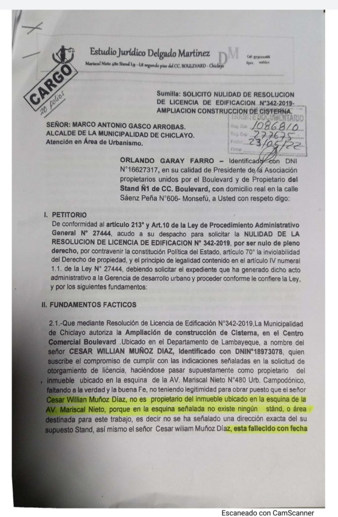 Según Garay Farro, con fecha 23 de mayo de 2022, solicitó al MPCH la nulidad de la Resolución de Licencia de Edificación N° 342-2019, “por ser nulo de pleno derecho, por contravenir la constitución Política del Estado, artículo 70° la inviolabilidad del Derecho de propiedad, y el principio de legalidad contenido en el artículo IV numeral 1.1. de la Ley N° 27444”. Se pregunta: ¿siendo la licencia de construcción el documento que acredita que los planos del proyecto han sido revisados por profesionales calificados, que se cumple con las normas vigentes y el Reglamento Nacional de Edificaciones, cómo es posible que no se hayan subsanado oportunamente las observaciones señaladas el 29 de abril del 2019, en la que textualmente dice: “Falta firma del propietario”?