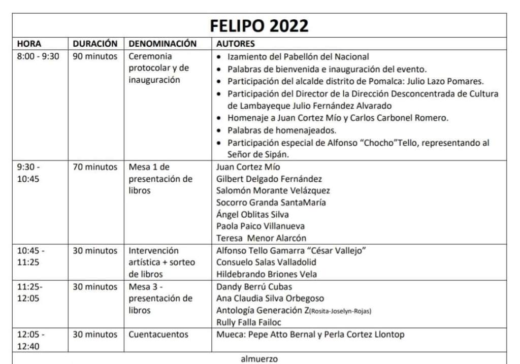 Este sábado 25, desde las 8 de la mañana a 8 de la noche, se desarrollará en Pomalca la Primera Feria del Libro-FELIPO, organizada por el Club de Lectura Generación Z, de ese distrito, en homenaje a los maestros Juan Cortez Mío y Carlos Carbonel Romero.