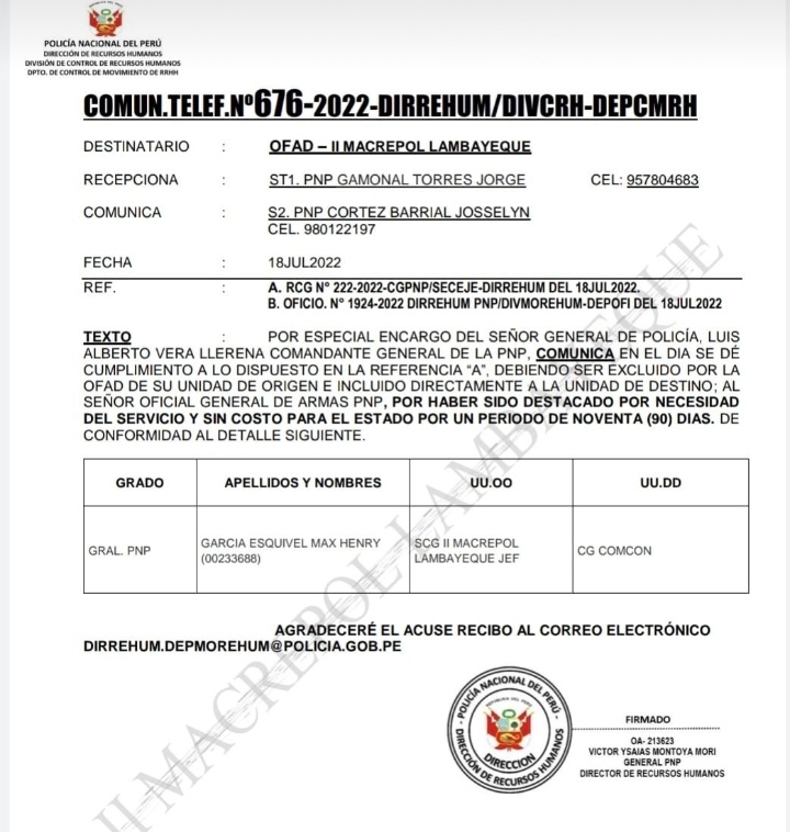 El Primer Despacho de la Fiscalía Provincial Corporativa Especializada en Delitos de Corrupción de Funcionarios de Lambayeque dispuso el inicio de diligencias preliminares contra el jefe de la II Macrorregión Policial, general PNP Max García Esquivel; como autor de la presunta comisión del delito de cohecho pasivo impropio en el ejercicio de la función policial.