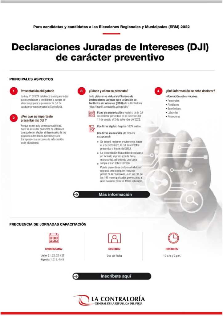 La Contraloría General recuerda a las organizaciones políticas de alcance nacional y a los candidatos inscritos formalmente en el proceso electoral que deberán presentar obligatoriamente su Declaración Jurada de Intereses preventiva del 11 de agosto hasta el 2 de setiembre, por medio de la plataforma virtual del Sistema de Declaraciones Juradas para la Gestión de Conflictos de Intereses (https://appdji.contraloria.gob.pe/djic/) que para tal fin se activará a fines de este mes para los candidatos válidamente inscritos al cual también se accederá por medio de la web www.gob.pe/contraloria