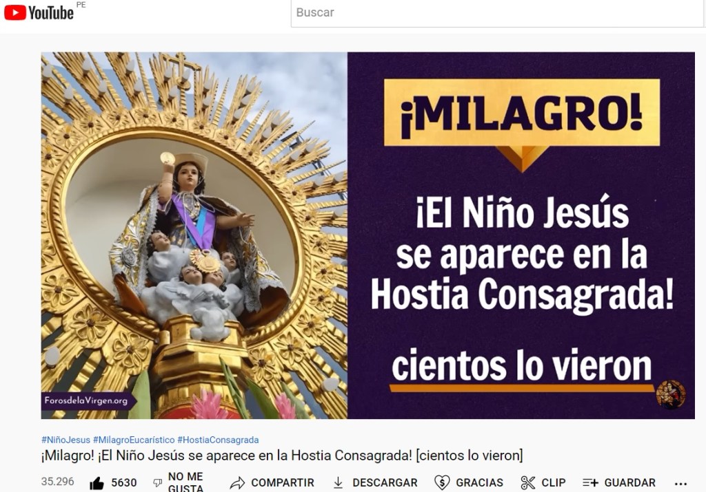 «En este video nos queremos detener en un milagro eucarístico con el Niño Jesús que sucedió dos veces, en Eten, Perú, en 1649, y que ha sido certificado por las autoridades civiles y eclesiásticas del momento, y todo ha quedado documentado», se escucha en la introducción del documental que dura 13 minutos con 30 segundos. Su canal de YouTube tiene más de 645 mil seguidores de todo el mundo. Solo a 48 horas de su lanzamiento contaba con 35 mil visitas.
